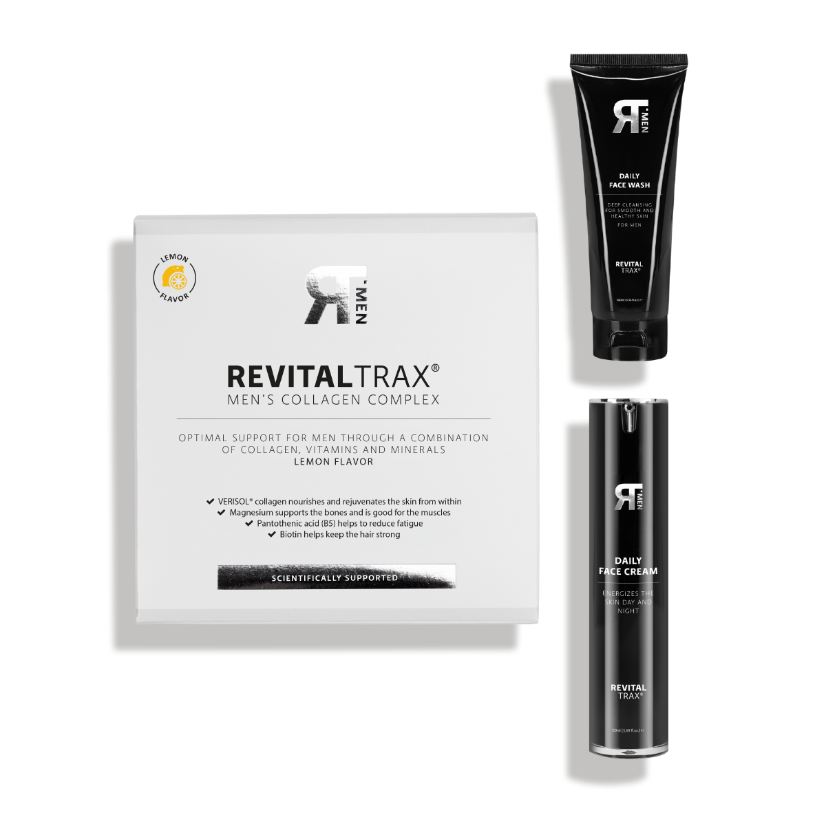 Der RevitalTrax Men’s Kollagen Komplex enthält 2,5 Gramm VERISOL® Kollagen, kombiniert mit einer kraftvollen Mischung aus Vitaminen und Mineralstoffen wie Magnesium, Eisen, Selen sowie den Vitaminen C, D3 und dem B-Komplex (B3, B5, B7, B12).